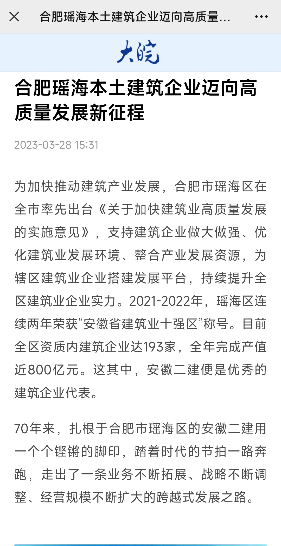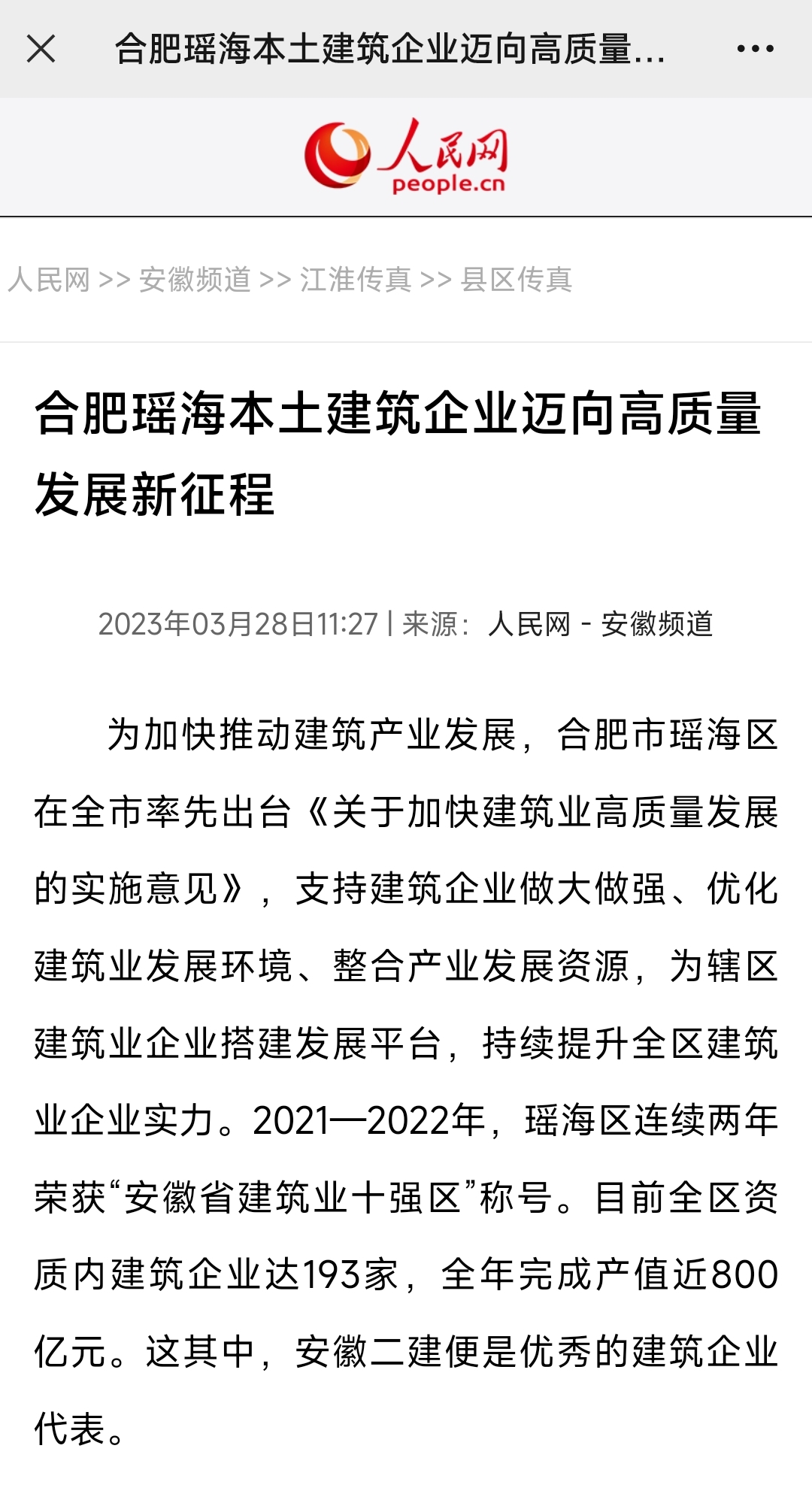 3月28日,人民網(wǎng)安徽頻道、中國網(wǎng)韻動安徽、中國日報網(wǎng)、安徽日報、大皖新聞、瑤海發(fā)布等權威主流媒體相繼報道安徽二建公司建企70周年發(fā)展成就,滿懷信心邁向高質量發(fā)展新征程。
