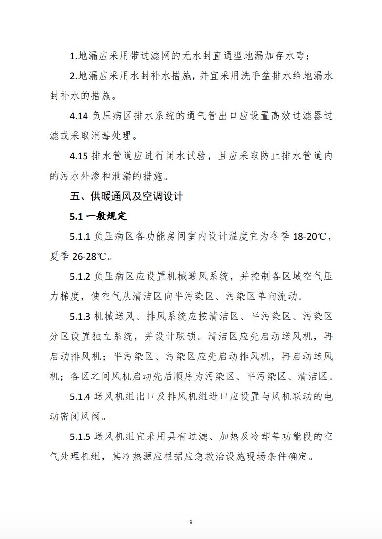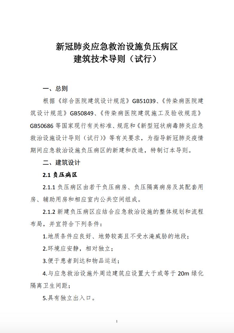 為進(jìn)一步做好新冠肺炎疫情防控工作,加強(qiáng)新冠肺炎應(yīng)急救治設(shè)施建設(shè),國家衛(wèi)健委辦公廳、住房和城鄉(xiāng)建設(shè)部辦公廳近日聯(lián)合印發(fā)《新冠肺炎應(yīng)急救治設(shè)施負(fù)壓病區(qū)建筑技術(shù)導(dǎo)則(試行)》,供各地結(jié)合防疫工作和實際需要參考執(zhí)行。導(dǎo)則包括建筑設(shè)計、結(jié)構(gòu)設(shè)計、給水排水設(shè)計、供暖通風(fēng)及空調(diào)設(shè)計、電氣及智能化設(shè)計、運(yùn)行維護(hù)等8個方面。