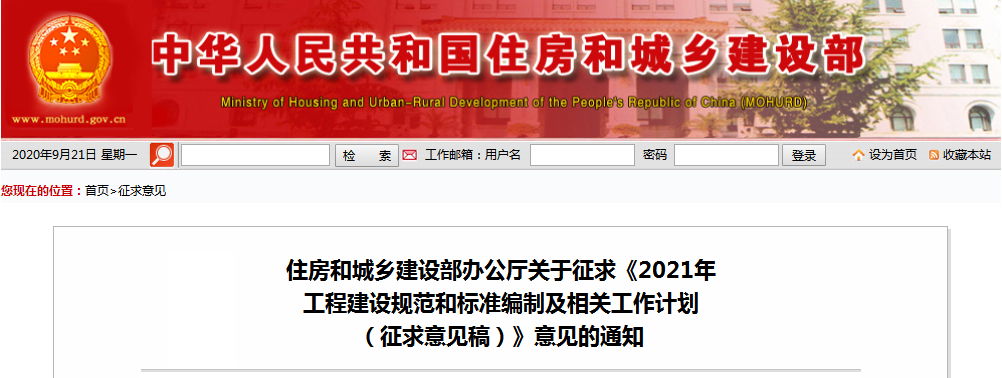 為滿足工程建設需要,落實工程建設標準體制改革要求,完善工程建設規范體系,住房和城鄉建設部會同有關部門和行業標準化管理機構,研究提出了《2021年工程建設規范和標準編制及相關工作計劃(征求意見稿)》?,F向社會公開征求意見。