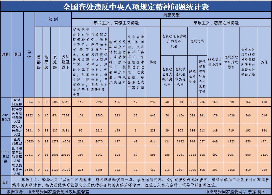 3月29日,中央紀委國家監委公布了2021年2月全國查處違反中央八項規定精神問題匯總情況。當月,全國各級紀檢監察機關共查處違反中央八項規定精神問題5864起,批評教育幫助和處理8422人,其中黨紀政務處分5631人。