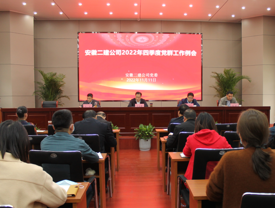 11月11日上午,安徽二建公司召開(kāi)2022年四季度黨群工作例會(huì)。黨委書(shū)記、董事長(zhǎng)許業(yè)勇出席會(huì)議并講話,公司領(lǐng)導(dǎo)李建成、王軍、沈壯出席會(huì)議,黨群部門(mén)人員、所屬各單位黨支部書(shū)記、工會(huì)主席、團(tuán)支部書(shū)記、綜合辦負(fù)責(zé)黨務(wù)工作人員參會(huì)。會(huì)議由王軍主持。